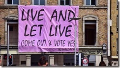 On the Yes front the mega banners are now appearing. This one on Liberty Hall is probably the biggest. So far at any rate. It’s about twice as tall as Joe Caslin’s “The Cladagh Embrace”. Which might (or might not) have been a Yes poster of some sort or other.